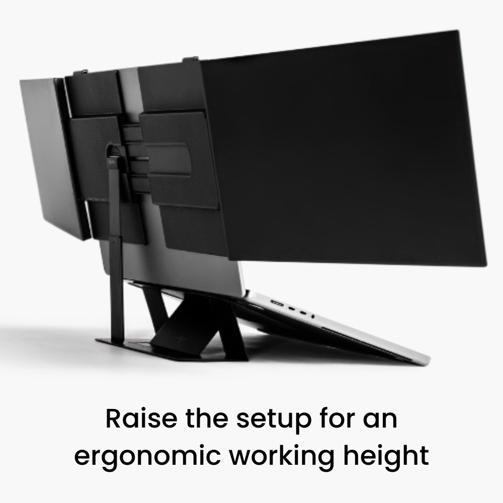 Ja, met de meegeleverde opvouwbare standaard kun je de hoogte van de hele opstelling iets verhogen. Zorg ervoor dat de standaard de tafel of het bureau waarop je werkt, kan bereiken om de laptop te ondersteunen